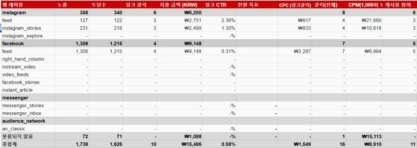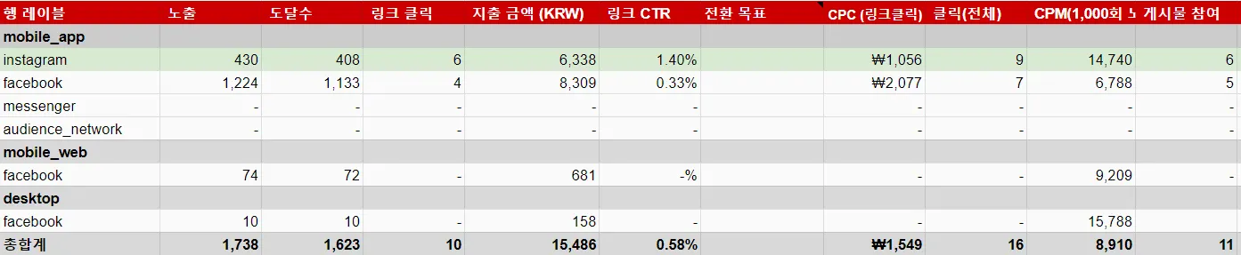 페이스북에서 많은 노출이 나왔지만, 전체적으로 링크클릭은 인스타그램이 더 많이 나옴.