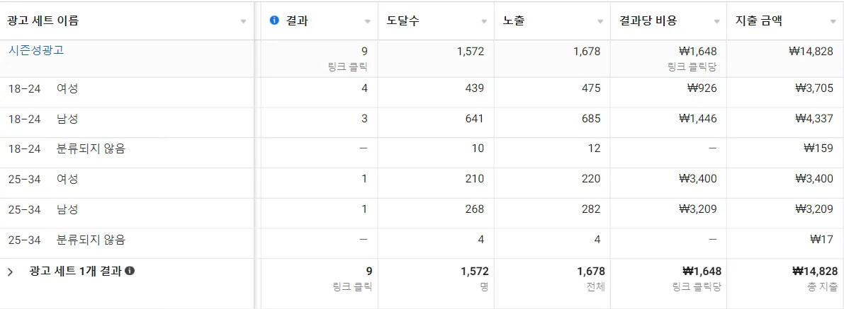 여성 전환율이 높았던 검증된 광고는 여성만 타겟팅 설정.