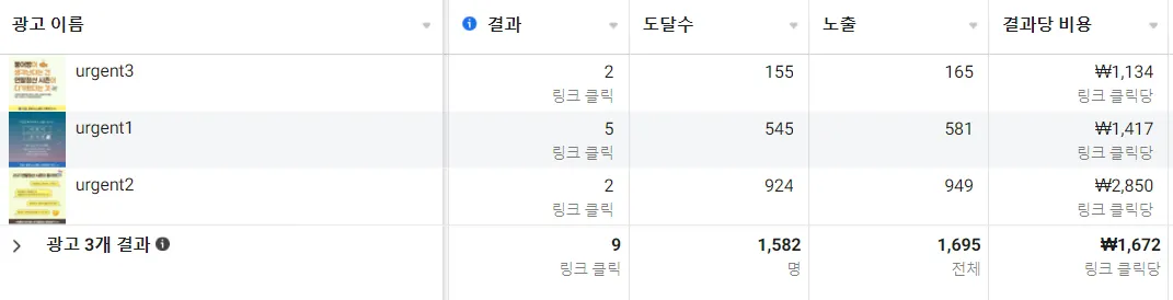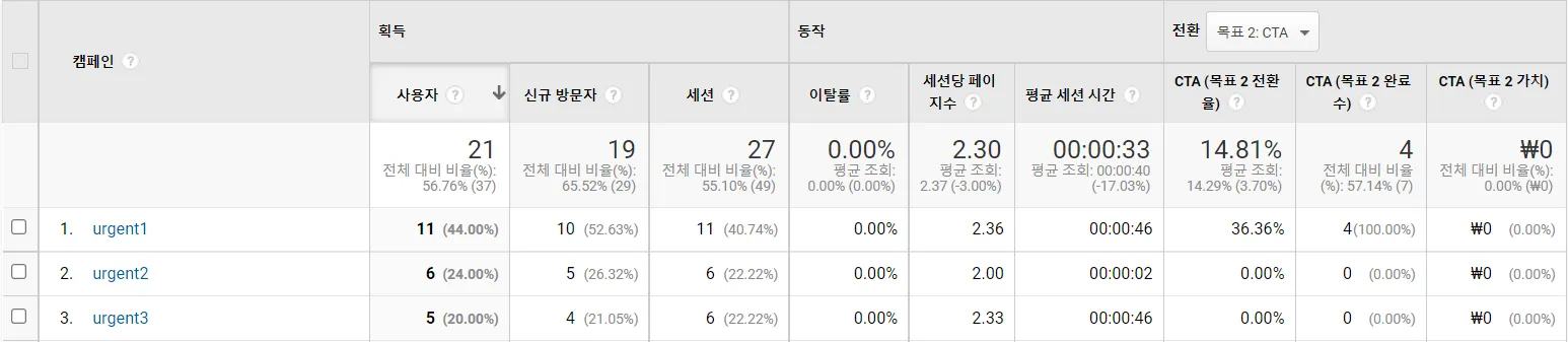 공감 4를 디벨롭한 광고 시안(urgent1)에서 모든 전환(4건)이 일어남 ( CVR은 36% )