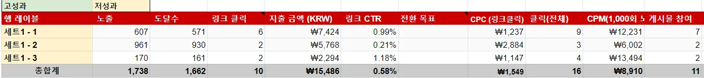 모든 광고 소재가 목표했던 CPA 850원 이하, CPC 300원 이하를 달성하지 못하여 저성과로 평가