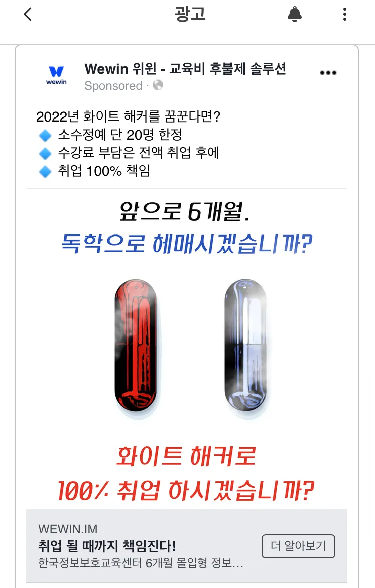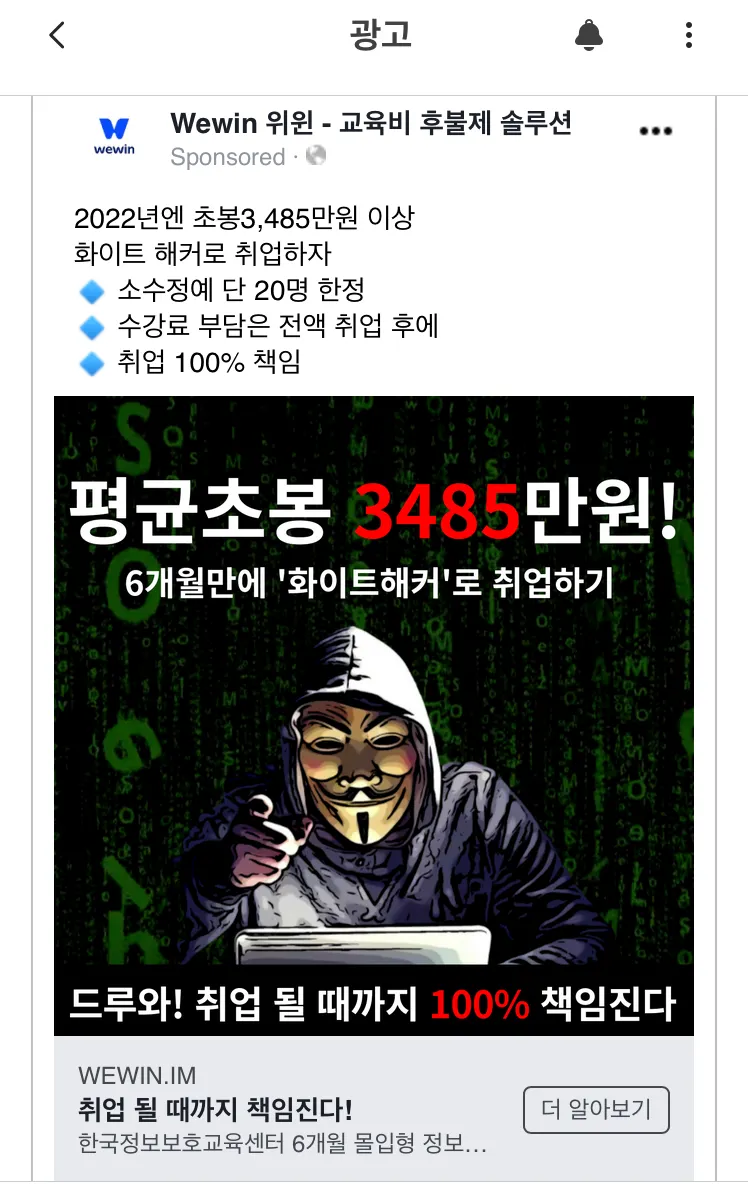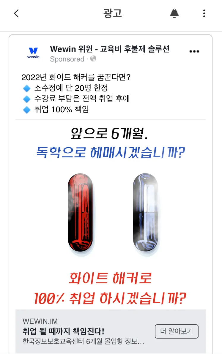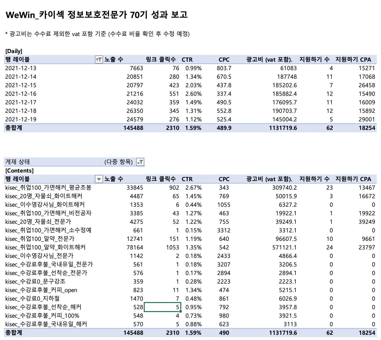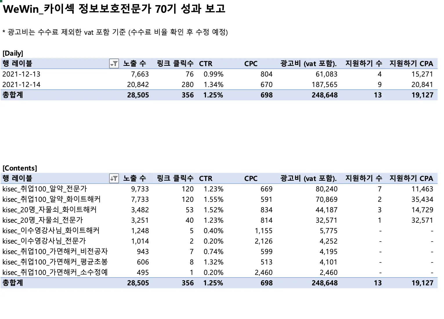 한국정보보호교육센터(KISEC) 70기 모집 페이스북 광고 집행 21.12.13 - 21.12.23 (11일)