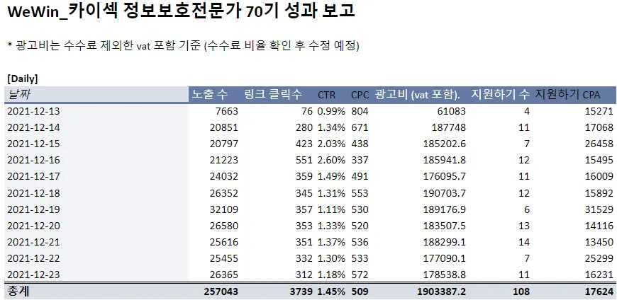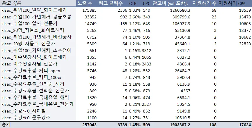 23일까지 지출된 광고비는 190만3256원(Vat 포함)으로 지원자수 17명을 모아